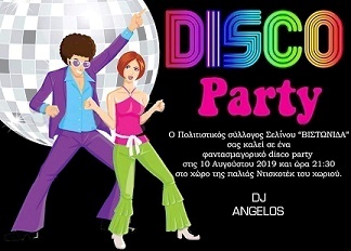 “Φαντασμαγορικό disco party” με τον dj Angelos διοργανώνει το βράδυ (21.30) του Σαββάτου 10 Αυγούστου στον χώρο της παλιάς ντισκοτέκ του χωριού (σημερινό “Μελτέμι”) ο Πολιτιστικός Σύλλογος Σελίνου “Βιστωνίδα”.