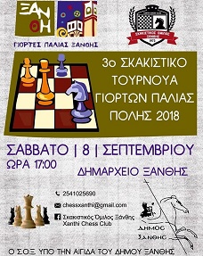 Το 3ο Σκακιστικό Τουρνουά Γιορτών Παλιάς Πόλης διοργανώνει το απόγευμα (17.00) του Σαββάτου 8 Σεπτεμβρίου στο δημαρχείο στην κεντρική πλατεία της πόλης ο Σκακιστικός Όμιλος Ξάνθης.