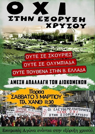 “Μετά τις δυο πετυχημένες δράσεις στο εργοτάξιο των Σκουριών, παρεμβαίνουμε στην πόλη θέλοντας να δείξουμε ότι ο αγώνας δεν σταματά” σημειώνουν οι Επιτροπές Αγώνα Ενάντια στην Εξόρυξη Χρυσού, καλώντας σε πορεία το Σάββατο 5 Μαρτίου στη Θεσσαλονίκη (εδώ το σχετικό τηλεοπτικό spot).