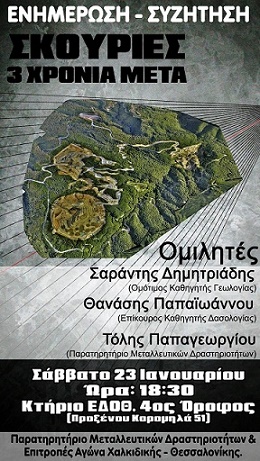 Με τίτλο «Σκουριές, τρία χρόνια μετά – αποκάλυψη τώρα» (για τα τρία χρόνια από την έναρξη της υλοτόμησης του δάσους στις Σκουριές), θα γίνει συγκριτική παρουσίαση των πεπραγμένων της εταιρείας στις Σκουριές, σε σχέση με τη Μελέτη Περιβαλλοντικών Επιπτώσεων και τους όρους της Απόφασης Έγκρισης Περιβαλλοντικών Όρων και των λοιπών εγκρίσεων. Τα αποτελέσματα είναι αποκαλυπτικά για την εταιρεία που επικαλείται τη νομιμότητα, επιδεικνύοντας παράλληλα την απόλυτη περιφρόνησή της γι’ αυτήν. Είναι επίσης αποκαλυπτικά για τις δημόσιες υπηρεσίες που επέτρεψαν και ανέχτηκαν τη δημιουργία ενός «κράτους εν κράτει» στη Χαλκιδική.