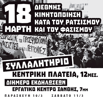 Σύσκεψη σωματείων, φορέων και συλλογικοτήτων διοργανώνεται το απόγευμα (19.00) του Σαββάτου 4 Μαρτίου στο Εργατοϋπαλληλικό Κέντρο Ξάνθης για την οργάνωση του αντιφασιστικού συλλαλητηρίου της 18ης Μαρτίου (12.00 στην κεντρική πλατεία), στο πλαίσιο της διεθνούς κινητοποίησης κατά του ρατσισμού και του φασισμού.