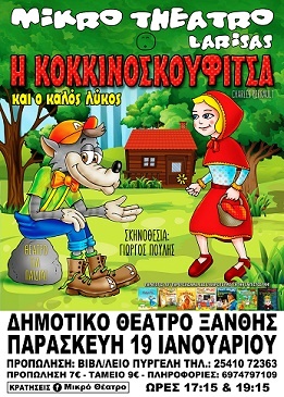 Στην Ξάνθη θα βρεθεί και πάλι την Παρασκευή 19 Ιανουαρίου ο εξαιρετικός θίασος του Μικρού Θεάτρου Λάρισας, παρουσιάζοντας σε δύο παραστάσεις (17.15 και 19.15) στο δημοτικό αμφιθέατρο το έργο του Charles Perrault “Η Κοκκινοσκουφίτσα και ο καλός Λύκος”.