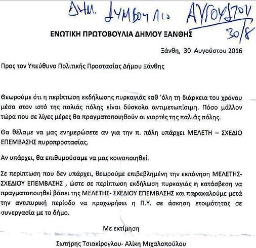 Λόγω της σοβαρής κατάστασης που δημιουργήθηκε στην Αθήνα και πιο συγκεκριμένα στην Ανατολική Αττική, όπως βλέπετε το ενδιαφέρον του Συνδυασμού μας, για παραγωγή έργου και πρόληψης προκειμένου να μην θρηνήσουμε και εμείς θύματα, καταθέσαμε σχετικό ερώτημα στον υπεύθυνο Πολιτικής Προστασίας Δήμου Ξάνθης, στις 30.08.2016, προ ημερήσιας διάταξης θέμα, που αφορούσε την πυρασφάλεια της Παλιάς Πόλης γενικότερα, και ειδικότερα για τις Γιορτές Παλιάς Πόλης, όπως και στις 18.06.2018, όπου πάλι σε σχετική ερώτηση προ ημερήσιας διάταξης, αναφερθήκαμε στους πυροσβεστικούς κρουνούς. Επειδή θεωρούμε ότι και τα δύο θέματα αυτά είναι στοχευμένα και επίκαιρα, να συζητηθούν άμεσα, δηλαδή σήμερα, στο Δημοτικό Συμβούλιο και να παρθούν ουσιαστικές αποφάσεις ώστε να πετύχουμε το καλύτερο δυνατό αποτέλεσμα.