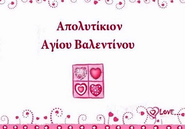 «Ἰταλίας τον γόνον, ἐρωτευμένων ἀγλάισμα καί τῶν πωλητῶν ἡ ἡμέρα, ἐν ᾖ θα κάνουν τὴν μπάζα τοὺς. Τιμήσωμεν ἐνδόξως οἱ πιστοί, ἁγίου Βαλεντίνου ἑορτήν. Ξενεροῦντας γὰρ φλογίζει ἐν τῇ θερμῇ, τοῦ ἕρωτος καψούρα. Δόξᾳ ὁ τῶν βελῶν εκτοξευτῆς, δόξᾳ μικροτσουτσούνων ἐλπίς, δόξᾳ σοὶ τῷ εὐρήσαντι ὑμίν καμμία γκόμενα».