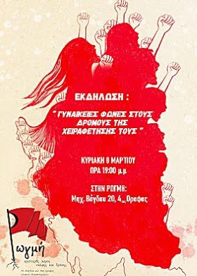 Εκδήλωση με θέμα «Γυναικείες φωνές στους δρόμους της χειραφέτησής τους» διοργανώνεται στη «Ρωγμή» το απόγευμα (19.00) της Κυριακής 8 Μαρτίου, παγκόσμιας ημέρας της γυναίκας.
