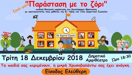 Παράλληλα, ο Πολιτιστικός Αθλητικός Σύλλογος Πυροσβεστών Ξάνθης σε συνεργασία με το Κέντρο Πολιτισμού Δήμου Ξάνθης, το 12ο Δημοτικό Σχολείο Ξάνθης, τον Σύλλογο Γονέων και Κηδεμόνων 12ου Δημοτικού Σχολείου Ξάνθης και τον Σύλλογο Διδασκόντων 12ου Δημοτικού Σχολείου Ξάνθης, παρουσιάζουν την παιδική θεατρική “Παράσταση με το ζόρι” του Χριστόφορου Μαλικιώση το απόγευμα (18.30) της Τρίτης 18 Δεκεμβρίου στο Δημοτικό Αμφιθέατρο Ξάνθης. Πρωταγωνιστές είναι ο δάσκαλος και τα παιδιά της Ε1 τάξης του 12ου Δημοτικού Σχολείου Ξάνθης. Η είσοδος θα είναι ελεύθερη, ωστόσο θα υπάρχουν δελτία οικονομικής ενίσχυσης του ενός ευρώ κατά την είσοδο στο θέατρο, για όποιον θέλει να βοηθήσει τη μικρή Χρυσοβαλάντω.